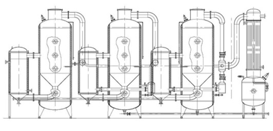 2、本濃縮器采用三效同時蒸發(fā),二次蒸汽得到反復(fù)作用,既節(jié)省了鍋爐的投資,又節(jié)約能源消耗,耗能與單效濃縮器相比降低70%。